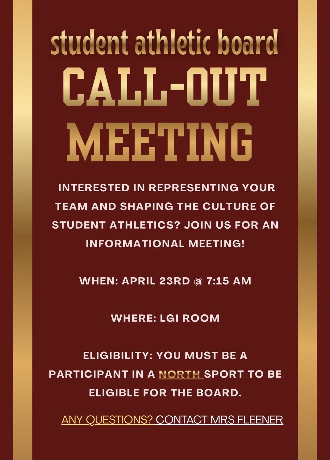 JOIN STUDENT ATHLETIC BOARD — Call-Out Meeting!Are you a student-athlete looking to lead by example and make a real impact on our school community? Student Athletic Board (SAB) is looking for you!